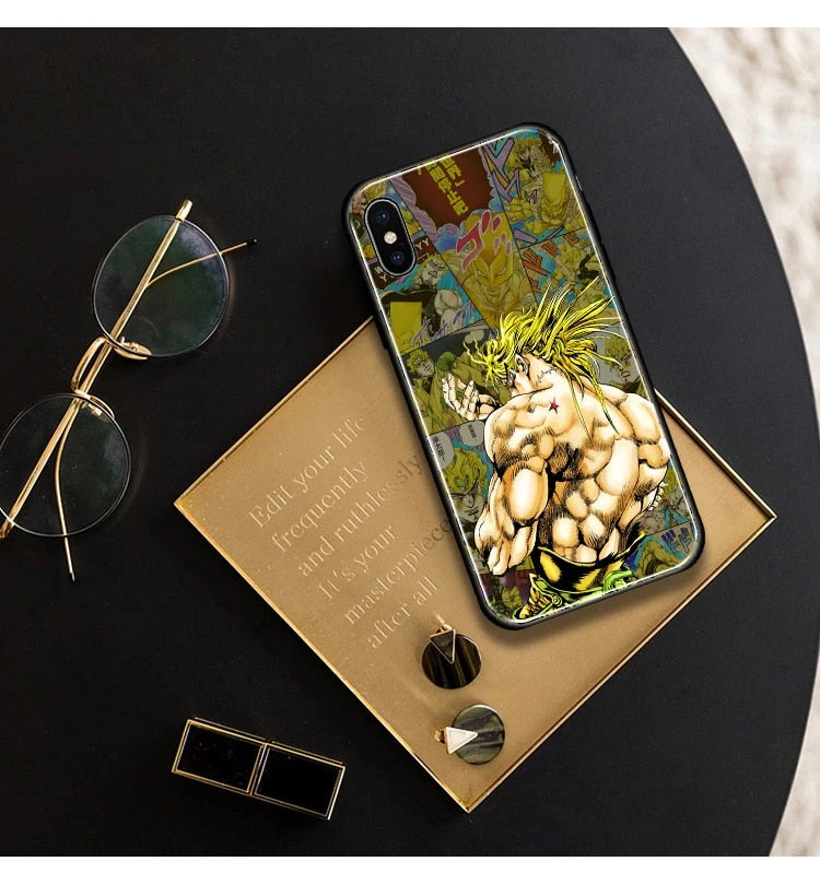 Coque JOJO pour iPhone en verre trempé ou silicone avec un design original, Dio Brando de la partie 3, fidèle au manga JoJo’s Bizarre Adventure.